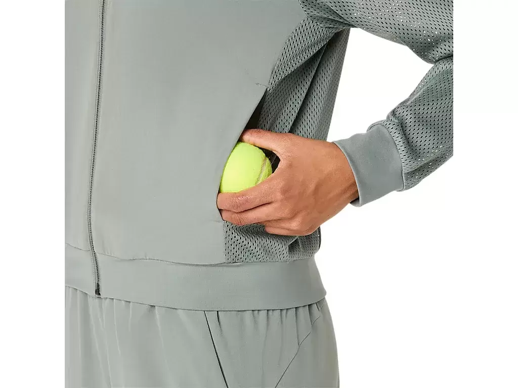 Questa giacca è dotata anche di tasche laterali che consentono di riporre almeno due palline da tennis e di spolverare l’argilla.