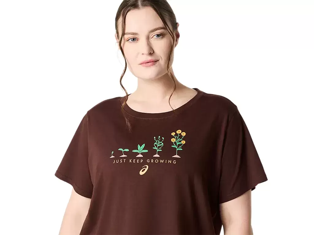 Questa comoda maglietta a maniche corte in maglia presenta una serie di grafiche di piante in diverse fasi del loro ciclo di crescita sul davanti. Presenta anche la frase “JUST KEEP GROWING” scritta sotto.