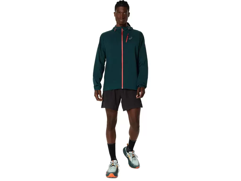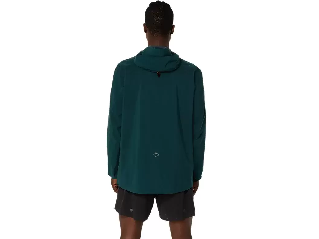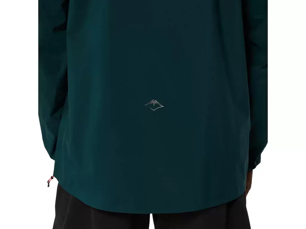 È inoltre dotata di collo alto e fori per i pollici per proteggere dagli agenti atmosferici, e di un cappuccio regolabile sul retro per una vestibilità personalizzata. Inoltre, la tasca sul petto può essere utilizzata per riporre gli oggetti essenziali per la corsa e per riporre la giacca.
