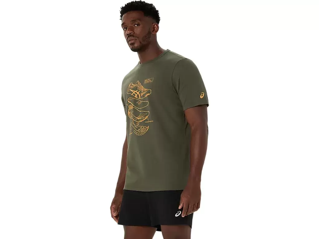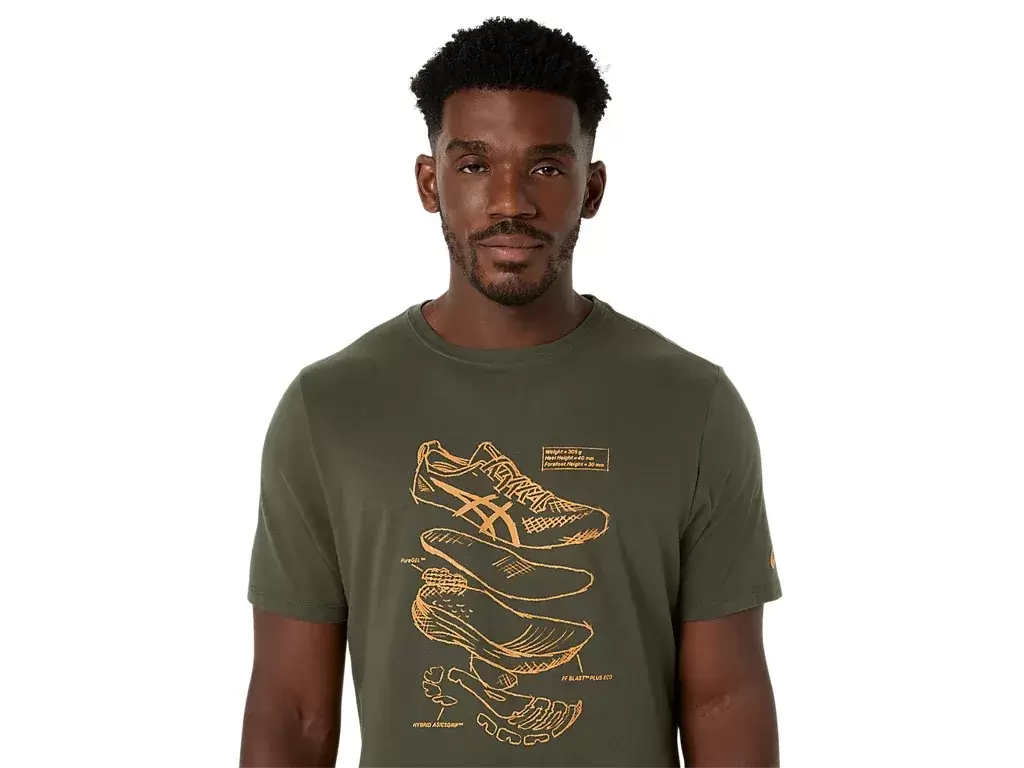 Questa comoda t-shirt a maniche corte in maglia trae ispirazione dagli schizzi delle scarpe da running ASICS ad alte prestazioni. È stampata con una grafica frontale che mostra i vari componenti utilizzati per realizzare le nostre scarpe da running.