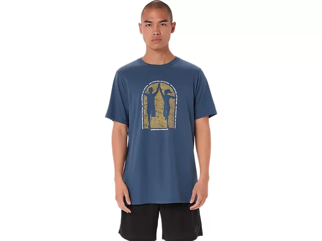 Questa comoda maglietta a maniche corte in maglia riconosce l’importanza della salute mentale a livello mondiale. La grafica frontale raffigura due runner che si tengono per mano e la frase “RUN TOGETHER, GO FURTHER” che decora il centro.