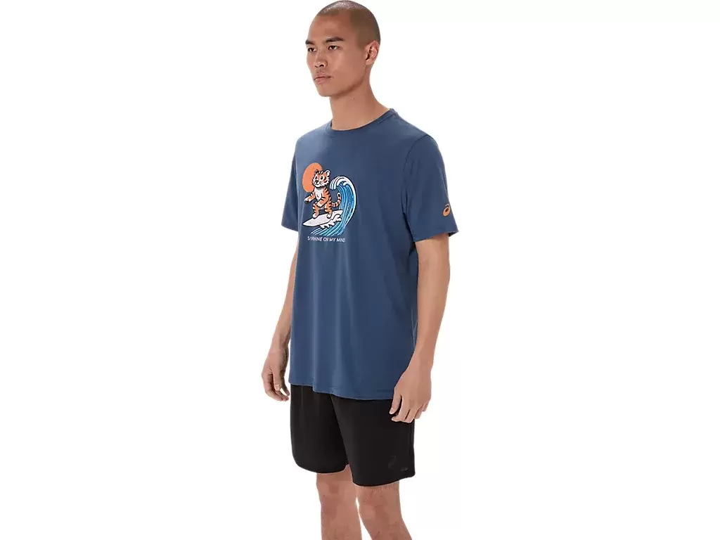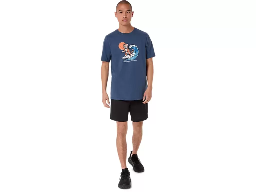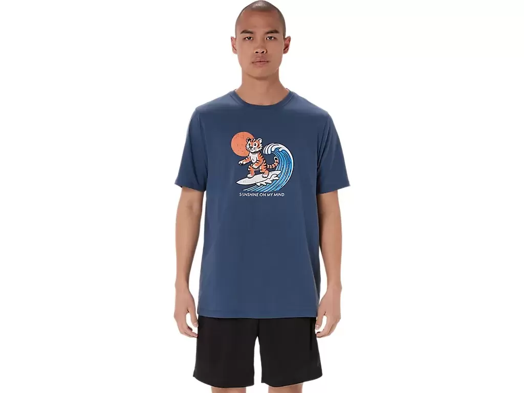 Questa comoda t-shirt a maniche corte in maglia trae ispirazione dalla spiaggia. La grafica frontale raffigura una tigre che fa surf, mentre la frase “SUNSHINE ON MY MIND” appare sotto.