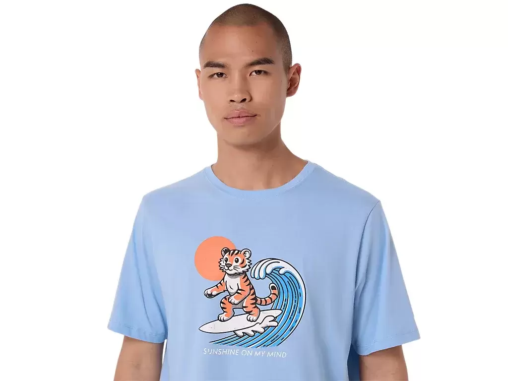 Questa comoda t-shirt a maniche corte in maglia trae ispirazione dalla spiaggia. La grafica frontale raffigura una tigre che fa surf, mentre la frase “SUNSHINE ON MY MIND” appare sotto.